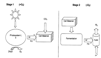 Consiste em utilizar microalgas e cianobactérias que em condições anaeróbicas dividem a molécula da água em hidrogénio e oxigénio, transferindo 4 eletrões dessa molécula para a enzima hidrogenase que está localizada no cloroplasto das algas e no citoplasma das cianobactérias.